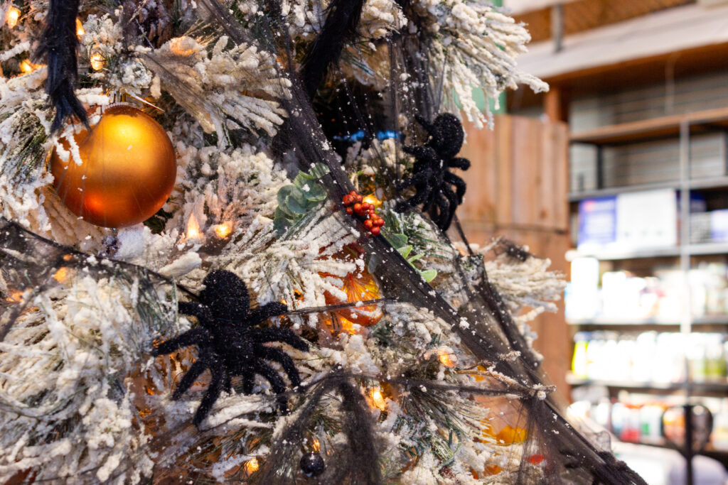 Les éléments vedettes de ce sapin sont sans aucun doute les araignées géantes installées dans l’arbre et même sur la structure environnante. Leurs longues pattes noires et leurs yeux rouges apportent une atmosphère digne d’un manoir hanté. Pour compléter, ajoutez un chapeau de sorcière au sommet, en guise d’étoile revisitée.