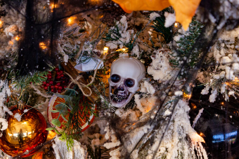 Les petites lumières intégrées au sapin donnent une ambiance mystérieuse une fois la nuit tombée. Préférez des lumières blanches ou orangées pour garder l’effet chic et effrayant.