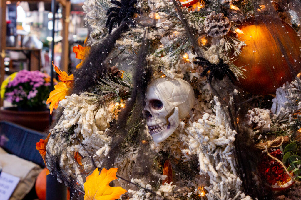 Un sapin enneigé ou givré est idéal pour créer un contraste frappant avec les couleurs chaudes de l’automne et les décorations sombres d’Halloween. Si vous n’avez pas ce type de sapin, un arbre vert artificiel fera aussi l’affaire, surtout si vous y ajoutez des toiles d’araignées noires.