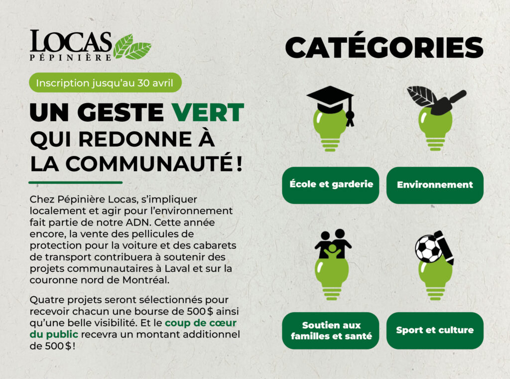 Chez Pépinière Locas, s’impliquer localement et agir pour l’environnement fait partie de notre ADN. Ce printemps, chaque pellicule de protection et chaque cabaret de transport vendu contribue directement à soutenir des projets communautaires à Laval et sur la couronne nord.
